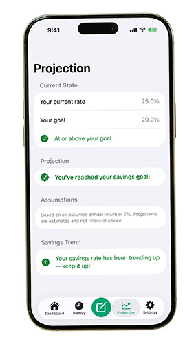 The Projection view takes your current savings rate and shows what consistent discipline looks like over time. Set a goal rate and track your progress month by month.