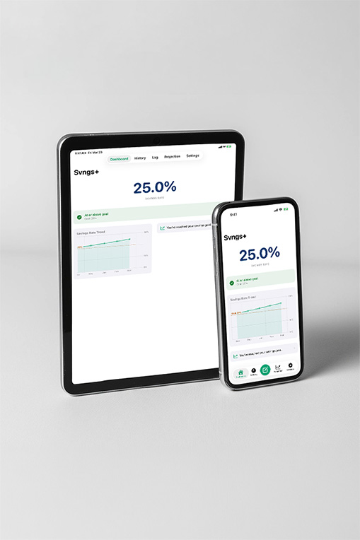 Svngs+ distills your financial picture into one meaningful number. Enter your monthly income and savings — the app does the rest, showing your rate at a glance every time you open it.